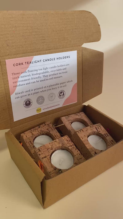 These cork floating tealight holder are 100% natural, biodegradable, recyclable and environment friendly. They produce no toxic residues and can also be used as a soil manure. This pack comes with a Diwali card printed on a plantable paper which can grow as a plant when bury in soil.