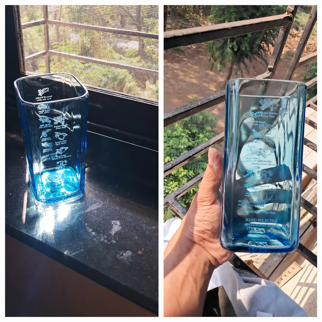 Made from Bombay Sapphire, this glass is perfect for all your favourite beverages. It can be used to entertain your friends and families by serving a mixed cocktail in them or at your desk at work. This is environment friendly and high appealing lifestyle products. The rim of the glass has been carefully smoothed and polished to remove any sharp edges and have a beautiful bevel.